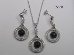 18" Necklace with Pendant and Earring Set Rhodium-Plated with round Cubic Zirconia and Lead-Free Glass Black Pearl in Gift Box