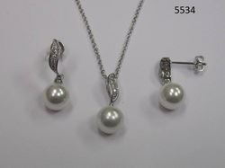 18" Necklace with Pendant and Earring Set Rhodium-Plated with round Cubic Zirconia and Lead-Free Glass White Pearl in Gift Box