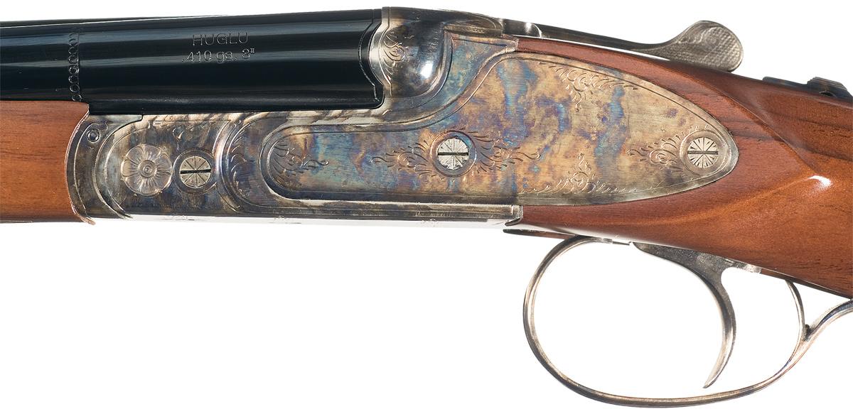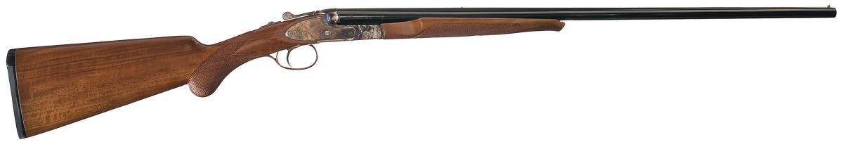 Single brass bead sight on the matte solid rib, 3 inch chambers choked modified/full with extractor. Lightly engraved casehardened action, upper tang, break lever, forearm release assembly and trigger guard. Single selective trigger and tang safety/selector. Mounted with a checkered semi-beavertail forearm and round knob pistol grip stock with black plastic and rubber insert buttplate. Length of pull is 14 7/8".