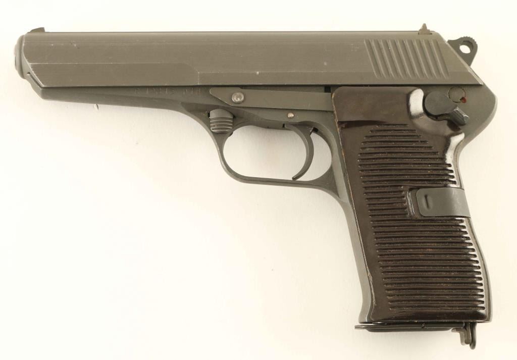 Czechoslovakian military roller-lock short-recoil operated semi-automatic service pistol chambered in 7.62x25mm, manufactured circa 1953. Imported by SSME of Plant City, F.L. with small import marks on the bottom of the slide under the ejection port. Features a grey oxide finish, 4.7" barrel, fixed blade front sight, dovetailed rear sight with 'u' notch, smooth trigger, serrated round hammer spur, thumb safety on the left side of the frame, heel magazine release, 8 round magazine, steel frame with wire lanyard loop and two-piece grooved brown composite grips. Serial numbers match on the barrel, frame and slide. Includes a smooth brown leather military holster dated "53", spare magazine, green nylon lanyard, cleaning rod, spare set of grips and two spare firing pins. Pistol exhibits approximately 97% of it's original finish showing some light high point edge wear, scattered handling marks and a very small amount of emerging surface rust observed in the cocking serrations on the slide. Action is very smooth although the slide does lock back on an empty magazine, the bore is pristine and the composite grips are near fine. Condition is near NRA Excellent. ***C&R Firearm***
