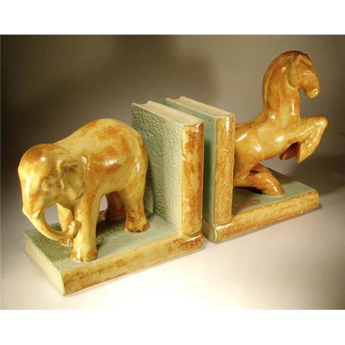 </font></strong>Spectacular Czechoslovakian figural Art pottery bookends depicting elephant and stallion. Signed on the base with makers logo mark (BB) and Made in Czechoslovakia. Also attached is paper label, which indicates that this was a commemorative piece made for 100 year anniversary of the makers existence (1837-1937). Unfortunately, we are unable to find what the BB stands for. Extremely RARE piece, not listed in any publications on subject!!! Quite large, dimension : Stallion - 9-1/2"H x 8"W x 5"D, Elephant - 7"H x 8-1/4"W x 5"D. Excellent condition, no chips or cracks. We have been dealing in Czechoslovakian items for over 30 years and this is only piece we ever seen. So, Collectors don't miss out on this rarity, you may NEVER find one in the future.....Please email us for more detailed photos, which are available. </font>
