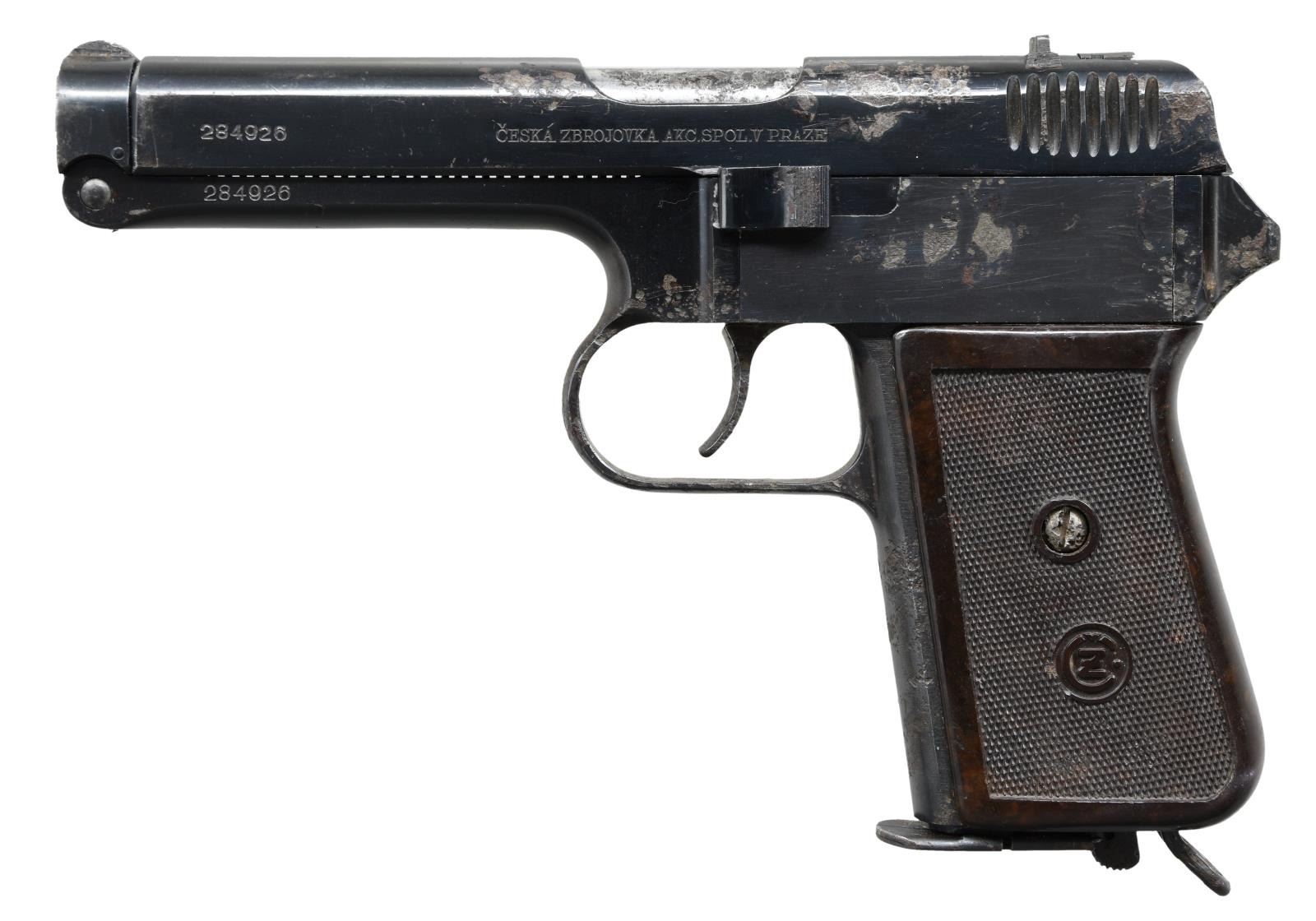 Cal. .380 ACP. S# 284926. Bbl 4-3/4". vz. 38 manufactured by CZ and accepted into Czech military service in 1939. Major metal components are blued, with the trigger and hammer being strawed. 1-piece checkered brown pressed resin "CZ" monogram grip. Right side of frame bears a "CZ" monogram followed by "E7 (Rampant Lion) 39" Czech acceptance proof, with additional Rampant Lion proofs present on top of the slide and barrel. MAGS: 1 9-round magazine. CONDITION: Metal components retain large amounts of their original arsenal blued finish, save for some scattered areas of deep pitting overall. Bright bore, exhibiting fair rifling and scattered spots of pitting throughout. Grip shows some scattered handling marks, but is otherwise fine. (23-1859/MLW). CURIO. $300-500