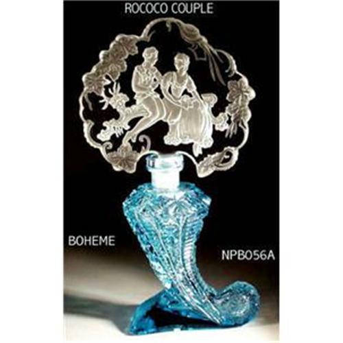 Gorgeous and rare 1930's "ROCOCO COUPLE" perfume bottle. The Aquamarine glass bottle is hand cut and polished. Breathtaking cut, polished and intaglio acid etched crystal stopper depicting Rococo Couple. The original 1930's stopper mold is no more available, so don't miss out on this opportunity to own this "gem". The color glass bottles range from the easy to find to extremely rare. Clear crystal is the least expensive, most common and easiest to find. The production of the Vaseline and opaque colors is the most expensive and most difficult to find. Rarity of colors : "1" easiest to find (Clear Crystal), "2" common, "3" intermediate, "4" scarce (opaque black), "5" rare (Vaseline, Malachite), "6" very rare (opaque blue-Lapis), "7" hardest to find (Turquoise-Aqua). For more details see pg. 11 in the publication listed below. This Aquamarine glass is rated "7" - hardest to find. Mint condition, dimension : 8"H, by BOHEME, Czech Republic. Please NOTE that WE are the ONLY source for this perfume bottle!!! Reference : "Made in Czechoslovakia" book #1, by Ruth Forsythe, page 27, # 214 or Book #2, page 80, #731. Please note that for Ebay Live Auctions only bids at or over $250.00 will be successful and meet our reserve.