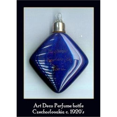 Lovely Czech Art Deco porcelain purse perfume bottle. Cobalt blue in color - Czech inscription in gold - Pozdrav z Karlovych Varu, which means in English "Greetings from Karlsbad". Nickel/chrome top, blown glass dauber. Excellent condition, Czechoslovakia c 1920's. Size : 3" high x 2-1/4 inches wide.