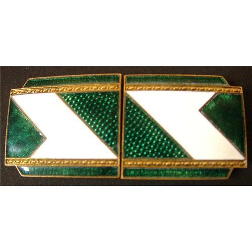 A FINE CZECH, ENAMEL ART DECO BUCKLE A SYNPHOEY OF GREEN AND WHITE BOUND IN GILT BRASS. IN NEAR MINT CONDITION. NO DAMAGE TO THE ENAMEL OR THE BRASS. FINE ADDITION TO YOUR COLLECTION AND IT CAN BE WORN