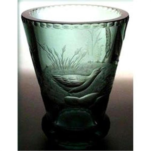 Stunning hand blown and cut steel green crystal vase with intaglio hand engraved Wildlife scene. Exquisite fine detailed Partridge and flying Duck with boulders, pond, grass, cattails and evergreens in the background.. The perimeters of top rim and the base are scallop hand cut. Until recently, this scarce (and most costly) type of Czech Art glass was "forgotten" in American publications on the subject. Please refer to the current book of "Collectible Bohemian Glass 1915-45, Vol. II" by Robert & Deborah Truitt, which is an excellent source of information for Collectors in this field. Pages 32-45 cover engraved glass. This vase survived its' 60-70 years of existence in excellent condition with no chips, cracks or repairs. Dimension : 5-1/4" H, 4" diameter, Kamenicky Senov, Czechoslovakia circa 1920-30's. May we ask you to consider this true collector's item? Please note that in some cases photo sizes are automatically reduced, so if you want to see full size or detailed pictures, please email us.