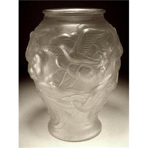 Beautiful Czechoslovakian satin finish glass vase with flying birds. Art deco era molded glass, excellent condition, no chips, cracks or repairs. Dimension : 9.5" high. Signed Czechoslovakia, Libochovice Glassworks circa 1930's.