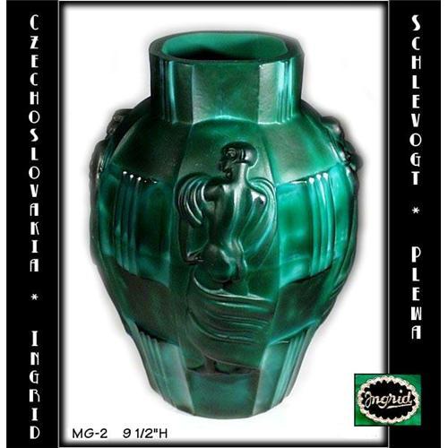 Beautiful Art Deco malachite glass vase in combination of frosted finish and hand cut work. Four semi draped females in relief are near the perfection. Designed by Prof. Arthur Plewa in 1930's for Henry Schevogt, made by Riedel Glass for Schlevogt's 1930's INGRID line. Henry Schlevogt took over Hoffman (his father in law" company and worked for several years to develop type of glass that had depth and richness of semi-precious stone like Jade, Malachite and Lapis. In 1934 INGRID line glass was unveiled. It was very successful to compete with Lalique glass in international markets. Signed "INGRID" on black/silver foil label. Signed "INGRID" on black/silver foil label. Dimension : 9-1/2"H. Please note : This is vintage vase - NOT current piece made in Czech Republic. Please note that in some cases photo sizes are automatically reduced, so if you want to see full size or detailed pictures, please email us.