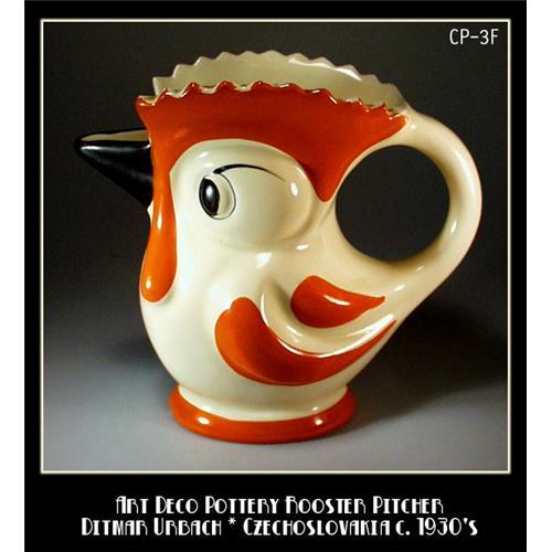 Please note that for Ebay Live Auctions only bids at or over $250.00 will be successful and will meet our Auction reserve.This colorful Czech Art Deco pottery "Rooster" pitcher was imported to the U.S.A. by Ebeling & Ruess Company in 1930's. The mark most commonly found on this piece is "Erphila", which is the acronym for the above Importer. Although quite scarce, this pitcher is even rarer, because it has the mark of the manufacturer - DITMAR URBACH. This piece survived its 70 years of existence in excellent condition - no chips, cracks or repairs. On the orange base rim there is a spot (1/8"), which was left unpainted at the factory. I checked with magnifying glass and see that the unpainted spot was glazed over. The base is marked : Ditmar Urbach, Czechoslovakia, T (which stands for Teplitz factory). Dimension : 7-1/4" high, Czechoslovakia circa 1930's. This pitcher is listed and pictured in the "Bible" on Czech pottery - "Czechoslovakian Pottery" by Bowers, Closser & Ellis, and valued at $300. Please see pages 92 and 217, item #561. The usual coloring of this piece is red black on cream/yellow base, this less common version is on white base.