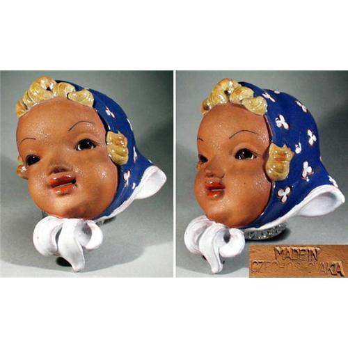 RARE - Exceptionally well modeled semi glazed Art Deco Terra Cotta wall mask depicting young girl wearing blue scarf with incised white flowers. The piece is excellent condition with no chips, cracks or repairs. Size 8"H x 6"W. Attached from the inside are glass eyes, which strangely seem to follow you regardless of which angle you are positioned from the mask. The back is incise "Made in Czechoslovakia" circa 1920-30's. The mate to this mask is under separate listing. Please note that in some cases photo sizes are automatically reduced, so if you want to see full size or detailed pictures, please email us.