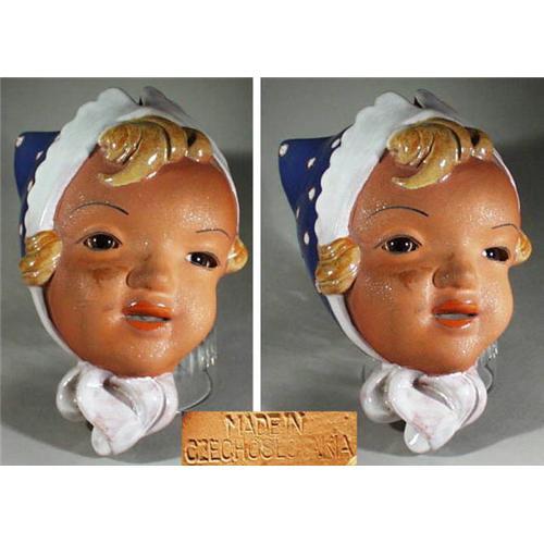 RARE - Exceptionally well modeled semi glazed Art Deco Terra Cotta wall mask depicting young girl wearing blue cap with incised white dots. The piece is excellent condition with no chips, cracks or repairs. Size 8"H x 6"W. Attached from the inside are glass eyes, which strangely seem to follow you regardless of which angle you are positioned from the mask. The back is incise signed " Made in Czechoslovakia", circa 1920-30's. The mate to this mask is under separate listing. Please note that in some cases photo sizes are automatically reduced, so if you want to see full size or detailed pictures, please email us.
