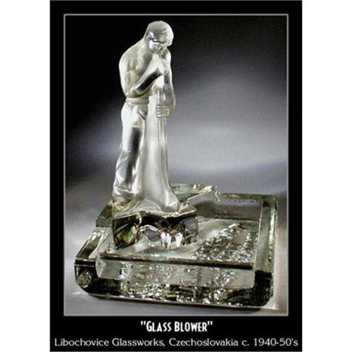 Scarce Art glass figurine depicting a Glass blower at work, cut and polished crystal base, satin finish figure. Based on the information from the Libochovice Glassworks (Sklarny), this piece was designed in the 1930's. Libochovicke Sklarny (Libochovice Glassworks) was the manufacturer of "Lalique" style animals, birds, figurines and vases,known in the U.S.A. as the "BAROLAC" line. This piece was made for Glass Export as advertisement piece. Excellent condition, no chips,cracks or repairs. Dimension : 6"H on a 4" x 4" square base, Czechoslovakia 1940-50's.