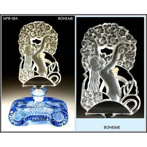 The "NYMPH & FLOWERS" is one of the best - and sought after - examples of the Czech figural perfume bottles from the Golden Era of 1920-39. This striking crystal and blue cut glass "Beauty" was recreated from the original 1930's mold by our own "BOHEME" Studio in the Czech Republic. The stopper has beautiful "Open work" acid etched (not SANDBLASTED) NYMPH and flowers design in relief, hand cut and polished to the perfection. The bottle is of completely hand cut and polished black amethyst glass. The quality of the workmanship is equivalent to the Vintage piece. Size : 6-3/4"H. MINT condition, no chips, cracks. We are not allowed to show actual photo of the stopper (some may consider it adult material), but we can email you photo without alternation.
