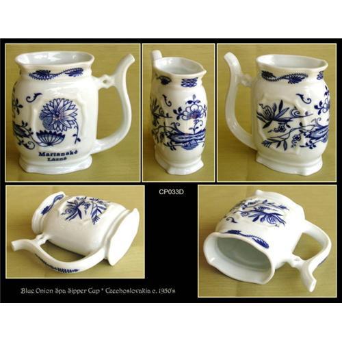 Beautiful Blue Onion hand decorated Czechoslovakian porcelain sipping cup. It is also called "Invalid feeder"(which is NOT correct) in the Czechoslovakian Pottery by Bowers - Closser - Ellis, see page 60, #111. The handle is hollow and used as a straw to drink spring mineral water found at various Spa locations. This utilitarian piece was very popular with visitors of Karlovy Vary (Carlsbad), Marianske Lazne (Marienbad), Teplice (Teplitz), world renowned Czech Spa towns. Excellent condition, no chips, cracks or repairs - dimension : 4"H x 4-1/4"W, Made in Czechoslovakia circa 1950's.
