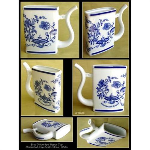 Beautiful Blue Onion hand decorated Czechoslovakian porcelain sipping cup - inscribed Marianske Lazne (Marienbad). It is also called "Invalid feeder"(which is NOT correct) in the Czechoslovakian Pottery by Bowers - Closser - Ellis, see page 60, #111. The handle is hollow and used as a straw to drink spring mineral water found at various Spa locations. This utilitarian piece was very popular with visitors of Karlovy Vary (Carlsbad), Marianske Lazne (Marienbad), Teplice (Teplitz), world renowned Czech Spa towns. Excellent condition, no chips, cracks or repairs - dimension : 5"H x 5"W, Made in Czechoslovakia circa 1950's.