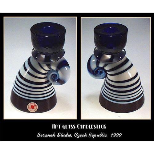 </font></strong>No other country in the world is more known for its Artistry in glass than Czechoslovakia. This hand blown arch candlestick in cobalt blue with fused white stripes is breathtaking. Excellent condition, no chips, cracks or repairs. Quite heavy piece (almost 2 pounds) Dimension : 5" high. Made in 1997 by renown Beranek Studio in Czech Republic, signed on the paper label. Great addition to your collection or to contemporary interior. Extremely difficult to capture the real beauty, which eye so easily perceives.... For Live Auction please email for larger photo</font>
