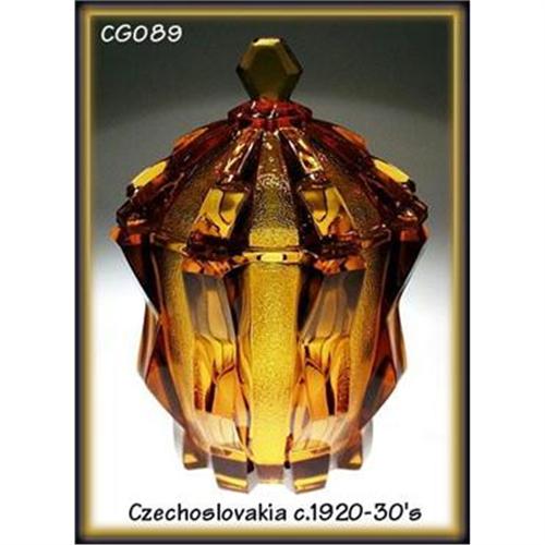 Very rare find of a "Czech Cubism" lidded bowl. Deep colored topaz glass, striking geometrical design. The lid has 2 chips on the inner side of the rim (not visible when covered), otherwise in excellent condition. Signed : CZECHOSLOVAKIA in raised molded letters on the base, design by V. Hoffman. Dimension : 8 1/2"high, circa 1920's. Please note that in some cases photo sizes are automatically reduced, so if you want to see full size or detailed pictures, please email us.