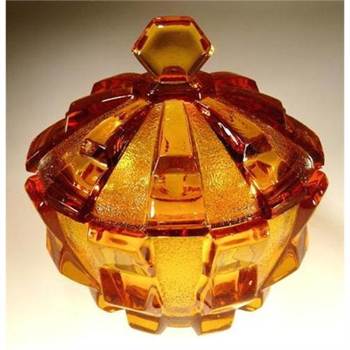 </font></strong>Very rare find of a "Czech Cubism" lidded bowl. Deep colored topaz glass, striking geometrical design. The lid has 1 shallow glass flake on the inner side of the rim (not visible when covered), otherwise in excellent condition. Unsigned, however other piece from the set (listed separately) is signed : CZECHOSLOVAKIA in raised molded letters on the base, design by V. Hoffman. Dimension : 5-1/2"high x 5.25" in diameter, circa 1920-30's.</font>