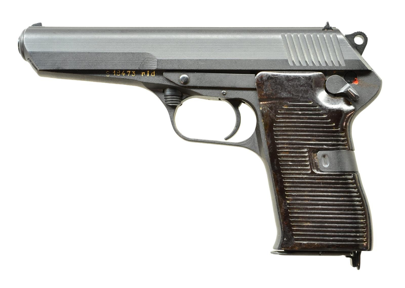 Cal. 7.62x25. S# S18473. Bbl. 4 1/2". Matching numbers on bbl. & slide. Import marking on right side of frame. Right side of frame also marked "VOP91, crossed swords & "53". Left side of frame marked w/ S # and "rid". Grooved brown bakelite grips. MAGS: 1 8 Rd. CONDITION: grips some flaking on left panel most notably at bottom, a few dings & some handling wear. Metal retains 95% arsenal reparkerized finish. Good bore w/ some light frosting. (22-3191/MJC). CURIO. $200-300.