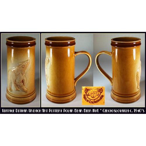 If you are REALLY interested in this item, please note that for Ebay Live Auction only bids at or above $110 will be successful and meet our reserve. Lovely Art pottery beer stein. The Polar Bear is raised in relief on light brown/cream glazed surface. The beer stein is in excellent condition with no chips, cracks, crazing or repairs. Dimension : 8"H, circa 1940's. The bottom has Made in Czechoslovakia - Ditmar Urbach (Teplitz) logo mark and incised number 2195. Please note that in some cases photo sizes are automatically reduced, so if you want to see full size or detailed pictures, please email us ().