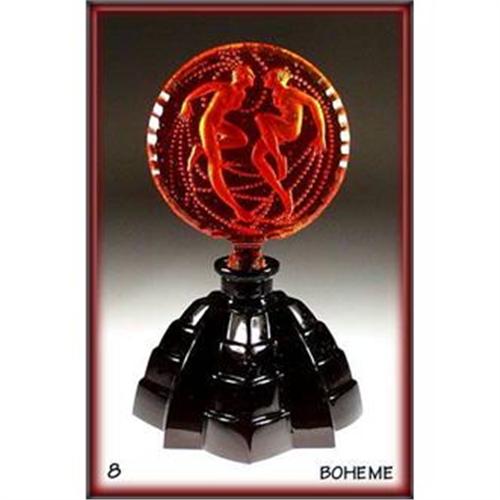 The "SIRENS" is one of the best - and sought after - examples of the Czech figural perfume bottles from the Golden Era of 1920-39. This black and dark Tangerine "Beauty" was recreated from the original 1930's mold by our own "BOHEME" Studio in the Czech Republic. The stopper has beautiful acid etched (not SANDBLASTED) two Nudes intaglio design, the front, back and contour is hand cut and polished to the perfection. To achieve "tangerine" color, gold and selenium are used. This chemical process creates tiny bubbles in tangerine glass stopper. The base of the bottle is also hand cut and polished. The quality of the workmanship is equivalent to the Vintage piece. This opaque black glass is rated "4" - scarce, however the combination of black and red is extremely scarce. Size : 5-1/4"H. MINT condition. Photo sizes are automatically reduced for Ebay Live Auctions. If you want to see larger, more detailed pictures, please email us