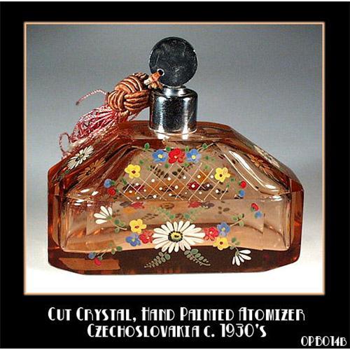 Beautiful Czech Vintage pink/peach perfume atomizer. Hand cut and polished with multicolor enameled decor. Excellent condition, no chips or cracks, original hardware and tassel. This atomizer is a part of 3 piece Vanity set. Each piece of the vanity set is under separate listing. Size : 4 "W x 4"H x 2"D. Czechoslovakia circa 1920's.