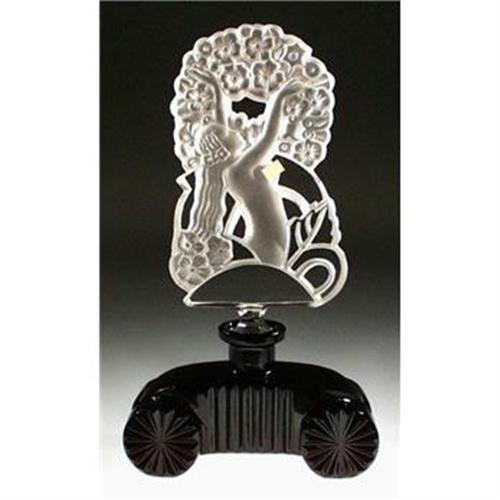 The "NYMPH & FLOWERS" is one of the best - and sought after - examples of the Czech figural perfume bottles from the Golden Era of 1920-39. This striking crystal and black glass "Beauty" was recreated from the original 1930's mold by our own "BOHEME" Studio in the Czech Republic. The stopper has beautiful "Open work" acid etched (not SANDBLASTED) NYMPH and flowers design in relief, hand cut and polished to the perfection. The bottle is of completely hand cut and polished black amethyst glass. The quality of the workmanship is equivalent to the Vintage piece. Size : 6-3/4"H. MINT condition, no chips, cracks. We are not allowed to show actual photo of the stopper (some may consider it adult material), but we can email you photo without alternation.