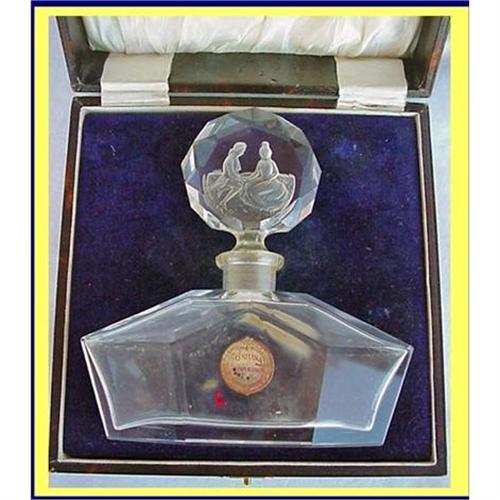 Czechoslovakian perfume / scent bottle with intaglio carved figural group. In original fitted