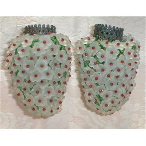 <p>100-200 clear glass flowers with red faceted bead centers. These are wired to a net covered with green glass beads. Wonderful decorator look or Victorian style for your boudoir or powder room.