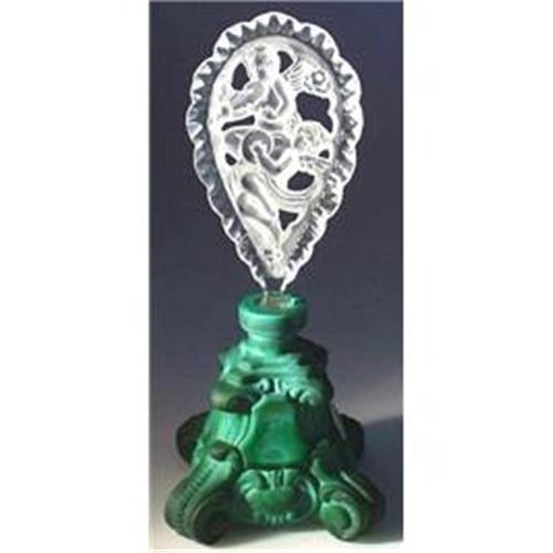 </font></strong>OUR EXCLUSIVE * not available by any other seller or gallery!!! The "CHERUBS" is one of the best examples of the Czech figural perfume bottles from the Golden Era of 1920-39. This gorgeous malachite glass color "Beauty" was recreated by the founder of the original 1930's molds "BOHEME" Studio in the Czech Republic. The "open" work stopper has two cherubs in relief, playing violin and cymbals. The bottle is hand cut and polished. The quality of the workmanship is equivalent to the Vintage piece. Reference: Czechoslovakian Perfume Bottles and Boudoir Accessories by J. North - Revised Edition, page 54, # 409 ($1,050.00). Size : 8-1/8"H. MINT condition.</font>