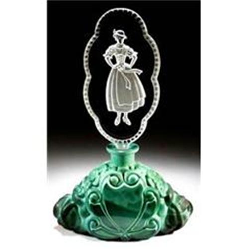 If you are REALLY interested in this item, please note that for Ebay Live Auction only bids at or above $140 will be successful and meet our reserve. This is outstanding malachite color glass perfume bottle...  Stopper was acquired among others in 1994 - unfinished from the old stock at the company, which was producing original Czechoslovakian perfume since 1920's.  This was a year before we discovered the original 1920-30's molds.  Couple years later we fitted this stopper with malachite color glass bottle, which is also from 1930's mold, but made in 1996. This is only piece we have - this stopper  is NOT being re-produced.  So, if you like it, don't miss out on this one, it won't be available in the future... Size : 7-1/2" high.  MINT condition.