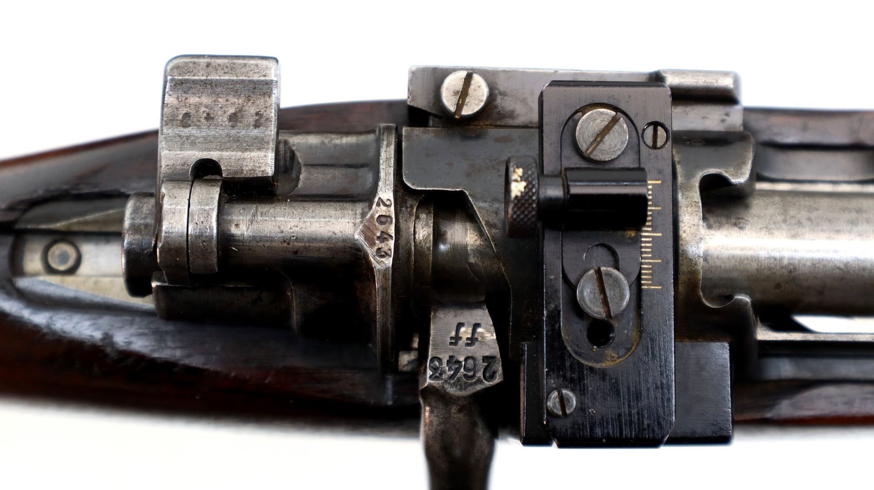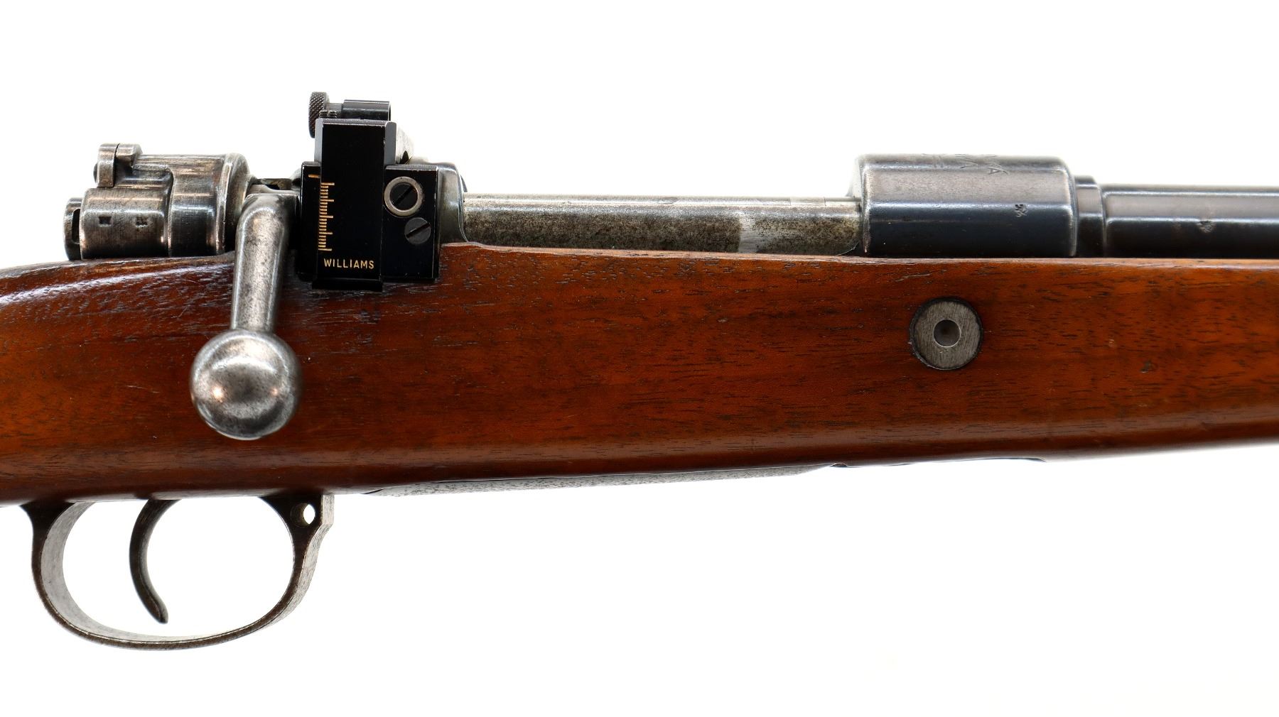 Main Description: Manufactured by Brno, serial numbers mismatched. Blade front sight with ramp, receiver drilled and tapped with adjustable Williams peep sight installed, blued finish, turned down bolt handle. One piece sporterized wood stock, pistol grip, smooth steel butt plate, stock cracked at heel, rear sling swivel only.