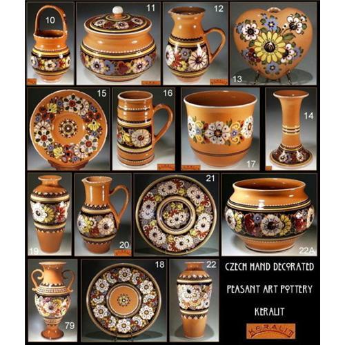 INSTANT COLLECTION of CZECH PEASANT ART pottery!!! Beautiful, hand made and decorated Peasant Art Pottery has a centuries long tradition in the former Bohemia/Czechoslovakia and now Czech Republic. "KERALIT" pottery is hand thrown, fired and decorated before final glazing by a skillful group of Artists. The folkloristic Peasant Art decor is eminent on all high quality pieces produced by this relatively small but renowned studio. Each item is incise stamped "KERALIT" and most are also Artist signed. This 7 pc set consists of basket #10, covered bowl #11, heart wall pocket #13, pair of candlesticks #14, vase #19 and large bowl #22A. Dimensions : Basket #10 (6.75" high), covered bowl #11 (4.75"H x 5" dia), heart wall pocket #13 (5" wide x 4.75"H), large bowl #22A (7.5" dia x 5.5"H), candlestick #14 (6"H), vase #19 (10"H). Since each piece is hand painted, there may be slight variation in the decor. More Czech peasant Art pottery available, see top photo. If interested in other pieces, please email us.