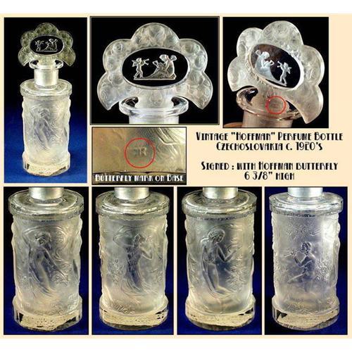 Gorgeous Czech Vintage clear frosted finish perfume bottle by Heinrich Hoffman from 1920's. Stopper has semi nude female and cherub. The bottle has three maidens and nude male playing flute on perimeter. Beautiful and sharp frosted image, signed with molded Hoffman "Butterfly" on the stopper and bottle (details shown). EXCELLENT condition, some roughness on upper neck of the stopper. Size : 6"H. Please NOTE, this is old VINTAGE piece - GUARANTEED!!! To show better detail, the bottle is filled with tea color liquid. Ref.: Jacquelyne North's Czechoslovakian Perfume Bottles and Boudoir Accessories, page 52, #385.