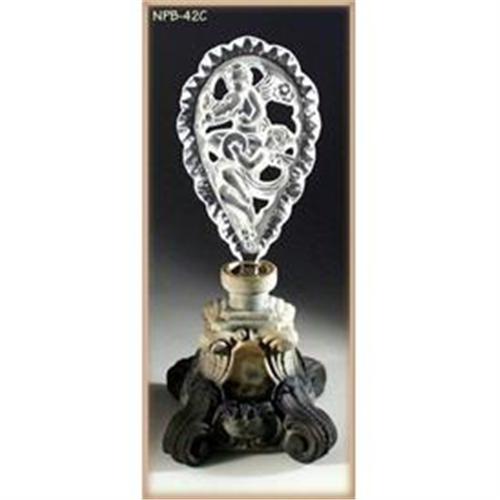 OUR EXCLUSIVE * not available by any other seller or gallery!!! The "CHERUBS" is one of the best examples of the Czech figural perfume bottles from the Golden Era of 1920-39. This RARE Corinthian marble glass was experimental and very unlikely to be duplicated in the future. This "Beauty" was recreated from the original 1930's mold by our own "BOHEME" Studio (1997) in the Czech Republic. The "open" work stopper has two cherubs in relief, playing violin and cymbals. The bottle is hand cut and polished. The quality of the workmanship is equivalent to the Vintage piece. The color glass bottles range from the easy to find to extremely rare. Clear crystal is the least expensive, most common and easiest to find. The production of the Vaseline and opaque colors is the most expensive and most difficult to find. Rarity of colors : "1" easiest to find (Clear Crystal), "2" common, "3" intermediate, "4" scarce (opaque black), "5" rare (opaque green-Malachite), "6" very rare (opaque blue-Lapis), "7" hardest to find (Turquoise-Aqua). This Opaque Corinthian Marble glass is not even rated since very few pieces were ever made before. Size : 8-1/8"H. MINT condition. Reference: Czechoslovakian Perfume Bottles and Boudoir Accessories by J. North - Revised Edition, page 54, # 409 ($1,050.00).