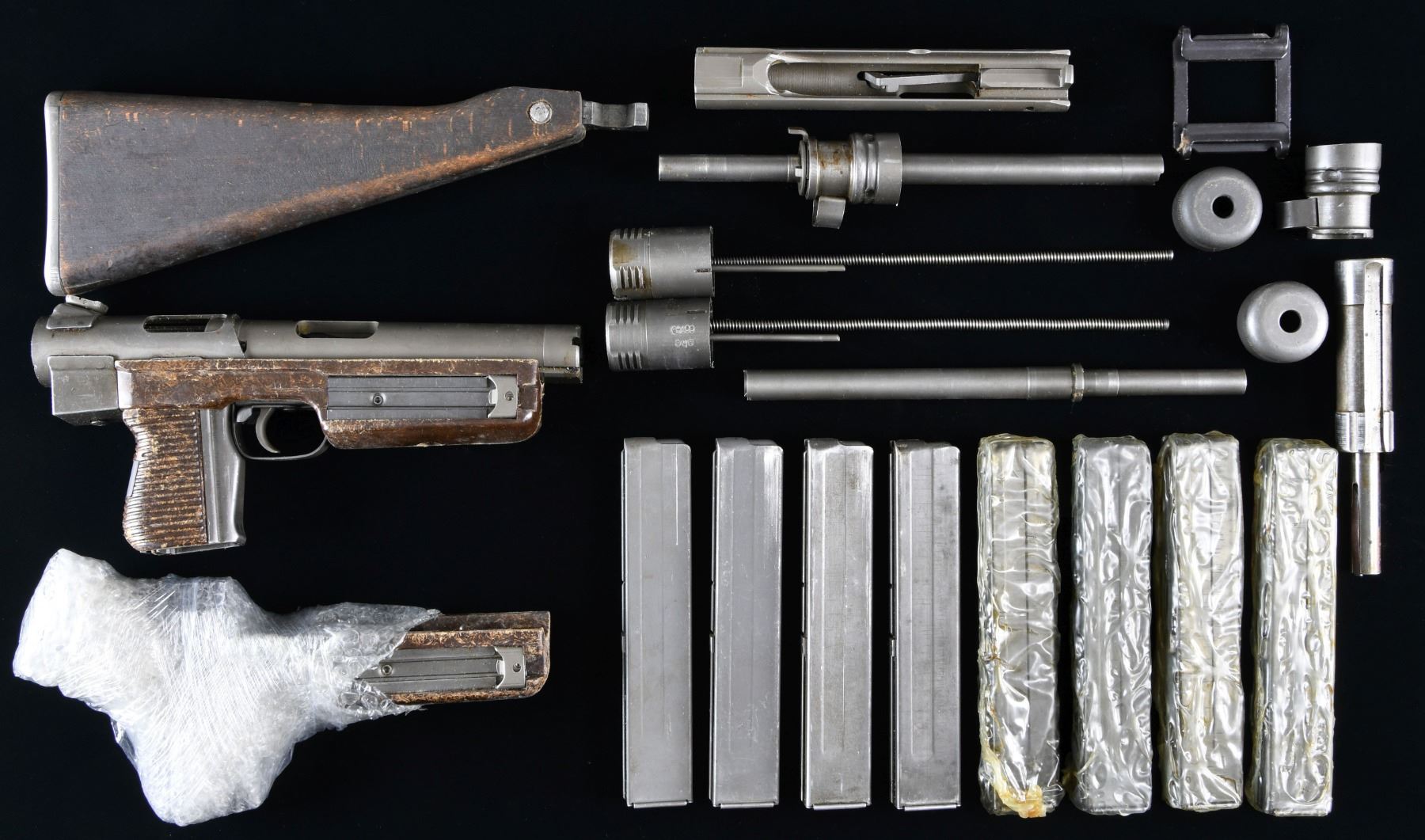 This lot consists of the following Czech SMG Parts: 1) Two 7.62x25 bbls. 2) One fixed hardwood buttstock. 3) One bolt assembly. 4) Two cut lower assemblies. 5) 1 Recoil spring assembly. 6) Two endcaps. MAGS: 8-32 rd. CONDITION: items show varying degrees of finish wear & some oxidation. PROVENANCE: From the Estate of Ivan Lee Shapiro. (02-23481/MJC). $600-900 for lot.