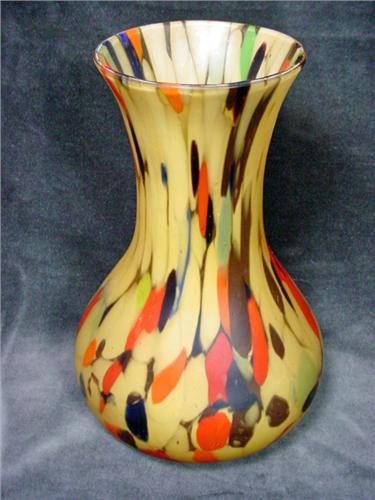 CZECH SATIN ART GLASS VASE IN MULTICOLORED ON A GOLD BASE. 8".