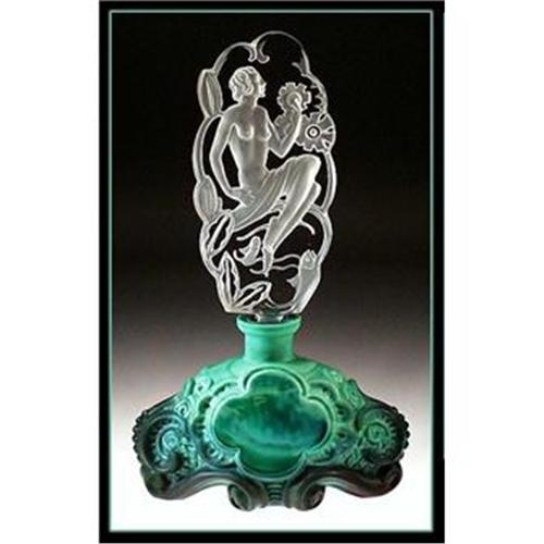 If you are REALLY interested in this item, please note that for Ebay Live Auction only bids at or above $150 will be successful and meet our reserve. Outstanding malachite glass perfume bottle... Cut and polished figural intaglio stopper fitted with cut and polished malachite glass bottle. This is our only piece, so, if you like it, don't miss out on this one, it won't be available in the future... Size : 7 3/8" high. MINT condition. Made by BOHEME Studio, Czech Republic.