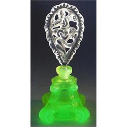 OUR EXCLUSIVE * not available by any other seller or gallery!!! The "CHERUBS" is one of the best examples of the Czech figural perfume bottles from the Golden Era of 1920-39. This gorgeous Vaseline / Uranium glass perfume bottle was recreated by the founder of original 1930's molds BOHEME Studio in the Czech Republic. The "open" work stopper has two cherubs in relief, playing violin and cymbals. The bottle is hand cut and polished. The quality of the workmanship is equivalent to the Vintage piece. The color glass bottles range from the easy to find to extremely rare. Clear crystal is the least expensive, most common and easiest to find. The production of the Vaseline and opaque colors is the most expensive and most difficult to find. Size : 8-1/8"H. MINT condition. Reference: Czechoslovakian Perfume Bottles and Boudoir Accessories by J. North - Revised Edition, page 54, # 409 ($1,050.00).