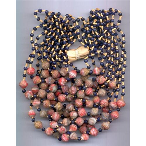 5 VINTAGE NECKLACES!!! For Ebay Live Auction only bids at or above $150 will be successful and will meet our Auction reserve!!! This is beautiful Czech Art Deco necklace composed of 11 mm multicolor molded glass "SHELL" beads along with small navy blue and tan color round and tube "filler" beads. Some necklaces have round metal tag "Made in Czechoslovakia", some are stamped "Czechoslovakia" on paper wrapper.. Dimension : 18.5" long, Czechoslovakia c. 1920-30's. In some cases the beads accumulated dust over the years and may need washing. Due to its age, stringing is quite fragile. Pictured are necklaces in its original wrapping, but you are buying 5 necklaces.!!! Multiple purchase will save on shipping cost. We have large quantity of Vintage beads - bead designers and dealers please inquire.
