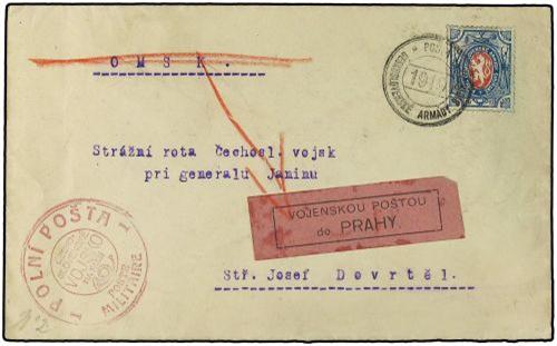 1919 Lion issue (25 kop.) blue and red adhesive tied in black to cover mailed to Omsk and returned with violet label ´Vojenskou Postou´do Prahy´. Red ´Polno Posta/Poste Militaire´ cachet at left and black handstamp on reverse. A fine and appealing cover.