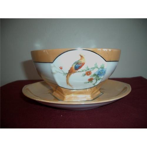 "MZ ALTROHLAU CM-R" Czech Opalescent SAUSER & BOWL this Opalescent set(c 1918 - 1939) Beautiful shaped art deco style "M Z Altrohlau CM-R Czechoslovakia" is stamped on the bottom of dish in green. The number 1310 is pressed in to the bottom of the dish. The sauser measures 6"inches & the and inchesbowl 3"x 5" Condition: Excellent colors are exquisite a pinkish or orange hand painted flowers and bird