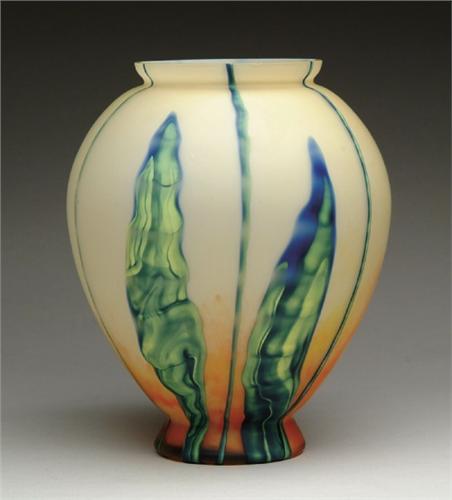 CZECHOSLOVAKIAN ART GLASS VASE. Marquetry art glass has yellow, green and blue stylized leaves extending from the foot towards to top shoulder. Marquetry leaves are set against a background of glass of orange shading to cream. Signed on the bottom "Czechoslovakia". SIZE: 9 in. t. CONDITION: Heat craze at bottom edge of foot and small chip on rim, otherwise very good. 5-61524