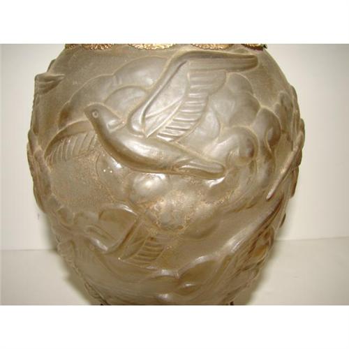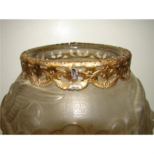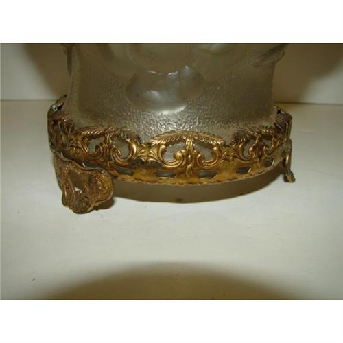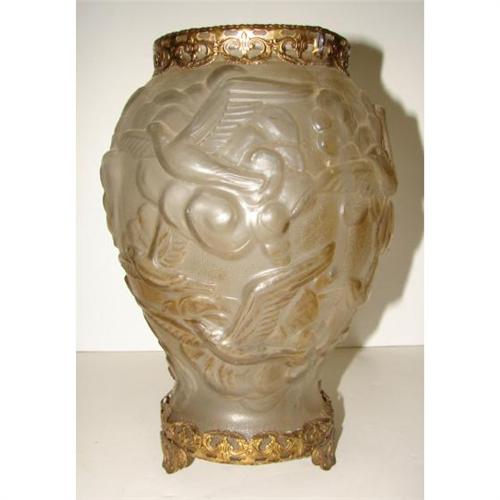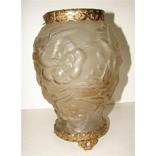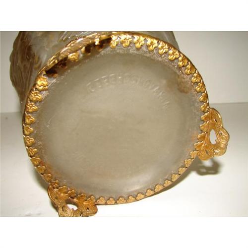 CZECHOSLOVAKIAN GLASS VASE. Clear glass vase with relief form bird and cloud decoration throughout. Vase has ornate applied gilt metal covering at top rim and at bottom of base. Embossed “Czechoslovakia” on bottom. 10” H