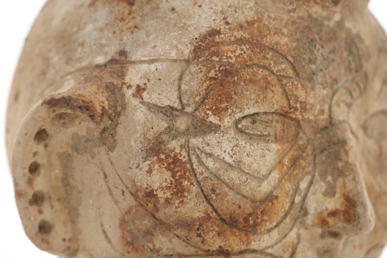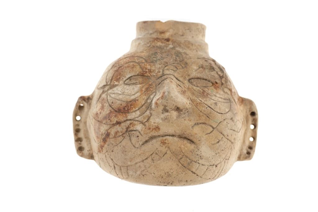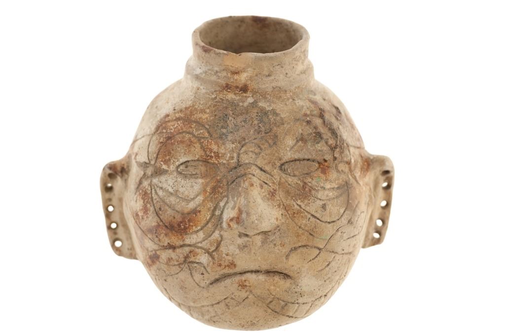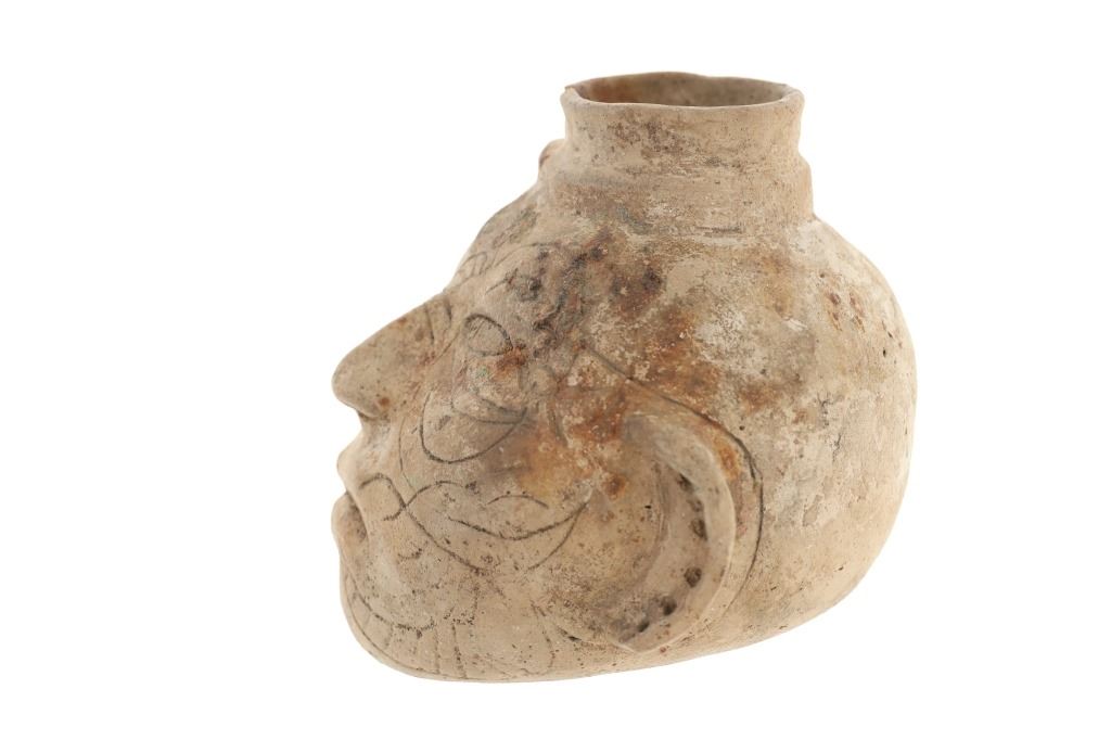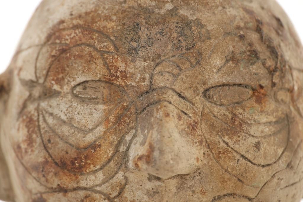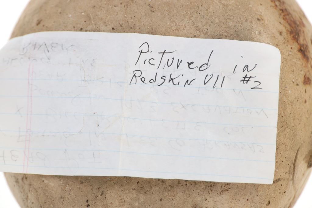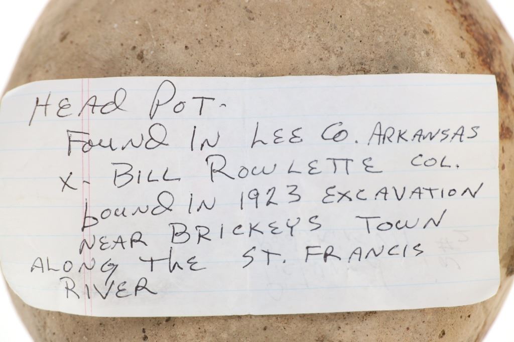 Provenance: From the ex-collection of Bill Rowlette (Bill Rowlett) renowned collector of head pot’s and other prehistoric artifacts; illustrated / pictured in The Redskin Volume VII Number 2 by the Genuine Indian Relic Society 1972; Found in Lee County Arkansas in a 1923 excavation near Brickeys Town along the St. Francis River. For other examples of Mississippian head pots, especially with a tattooed like finish see the example in the Hampson Museum State Park in Wilson, Arkansas State University Museum piece from the Nodena Site near Wilson and the 1350-1550 Headpot in the Detroit Institute of Arts collection. All these and other examples are incredibly similar to our example showing prominent facial features, slit like opening eyes, ears that are pierced each multiple times, prominent tattooing etching along the entire face and a two stepped opening or top rim. Accompanied by a small piece of paper with the provenance written on it. The pot is well kept with a small chip at the top otherwise no other major damages. Measures 7-inches across by 6-inches deep by 6-inches high. This example is truly astounding, with a larger size than the Heritage example and truly historic and beautiful tattoo etching.