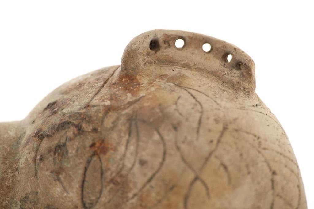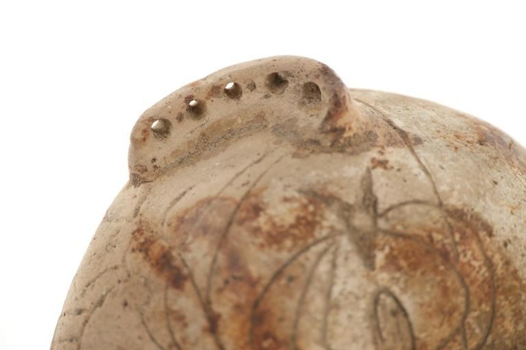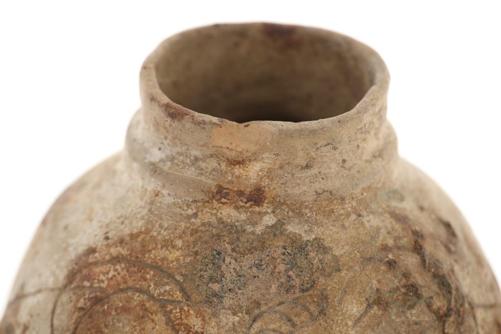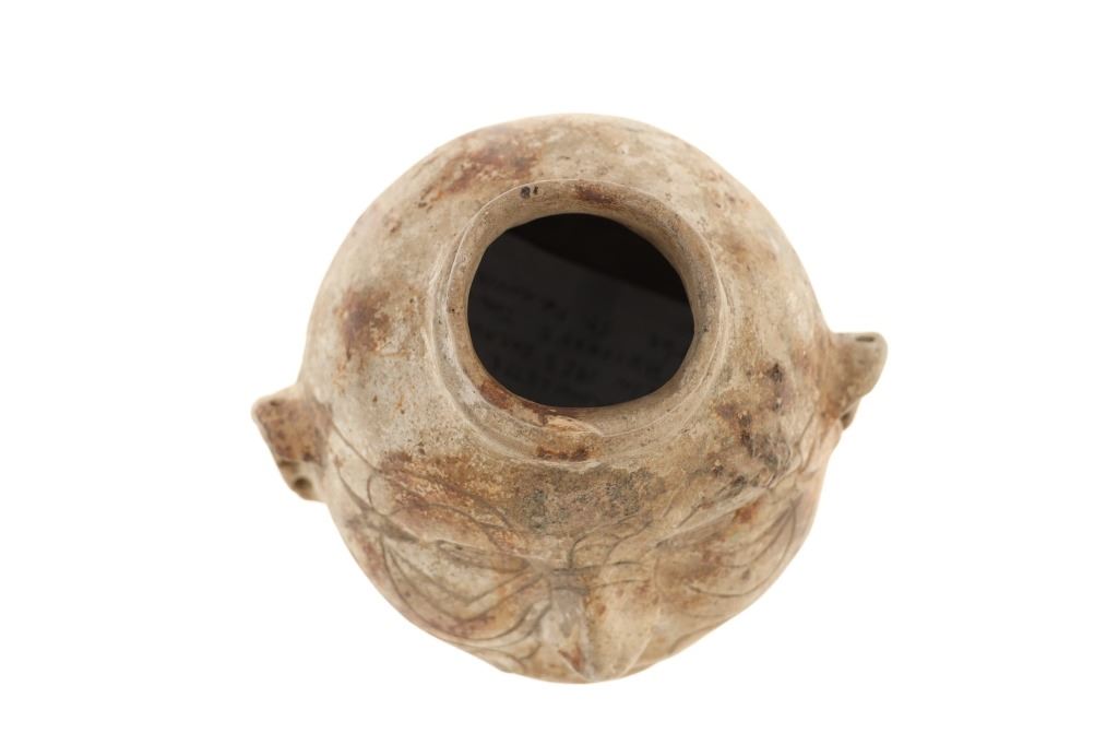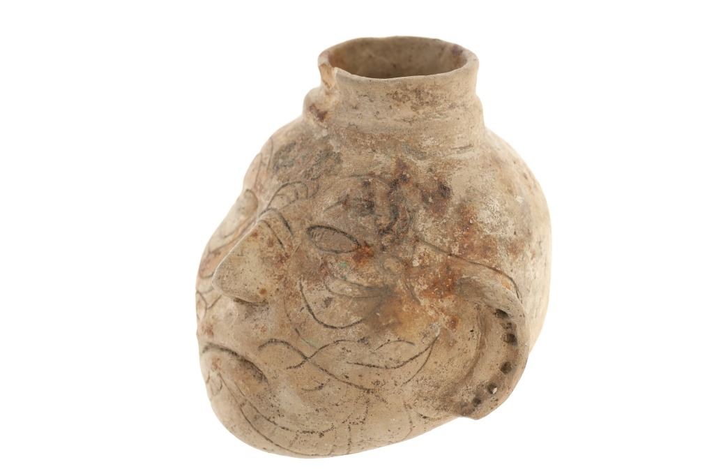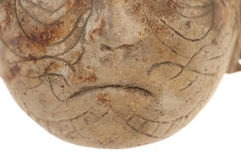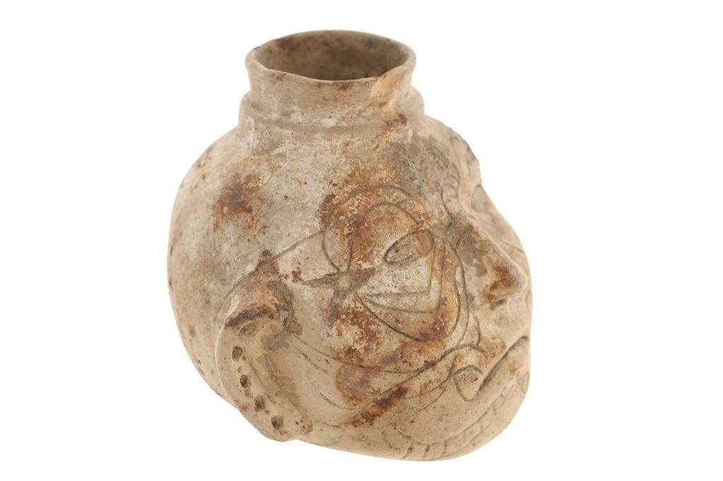 Provenance: From the ex-collection of Bill Rowlette (Bill Rowlett) renowned collector of head pot’s and other prehistoric artifacts; illustrated / pictured in The Redskin Volume VII Number 2 by the Genuine Indian Relic Society 1972; Found in Lee County Arkansas in a 1923 excavation near Brickeys Town along the St. Francis River. For other examples of Mississippian head pots, especially with a tattooed like finish see the example in the Hampson Museum State Park in Wilson, Arkansas State University Museum piece from the Nodena Site near Wilson and the 1350-1550 Headpot in the Detroit Institute of Arts collection. All these and other examples are incredibly similar to our example showing prominent facial features, slit like opening eyes, ears that are pierced each multiple times, prominent tattooing etching along the entire face and a two stepped opening or top rim. Accompanied by a small piece of paper with the provenance written on it. The pot is well kept with a small chip at the top otherwise no other major damages. Measures 7-inches across by 6-inches deep by 6-inches high. This example is truly astounding, with a larger size than the Heritage example and truly historic and beautiful tattoo etching.