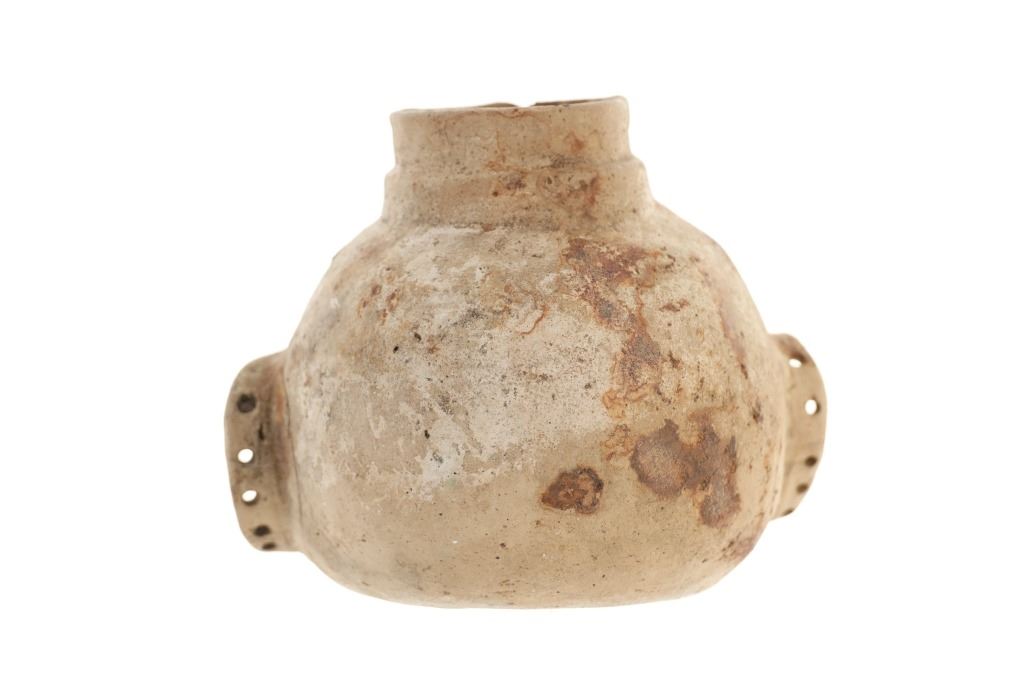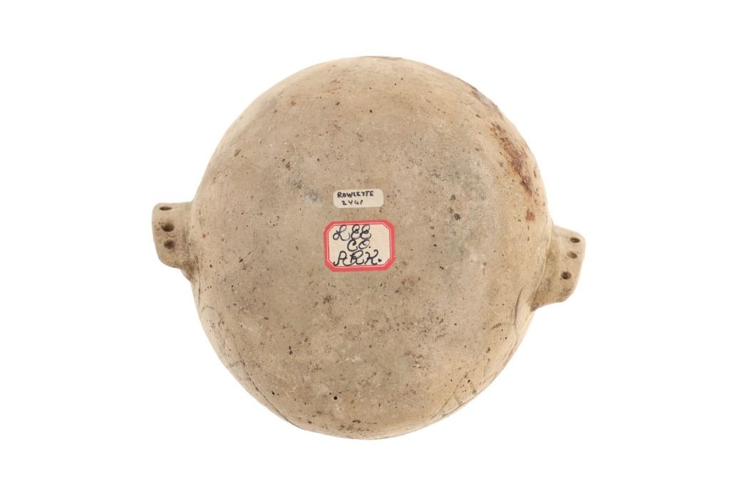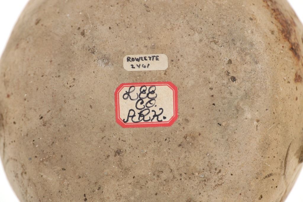 This is a circa 1400-1500 Mississippian Quapaw polychrome painted head pot from Lee County, Arkansas from the renowned Bill Rowlette collection and pictured in The Redskin Volume VII Number 2. For reference of other head pots from the Bill Rowlette / Rowlett collection see the Mississippian Polychrome Head Pot from Bill Rowlett which sold at Heritage Auctions November 2017 auction for $21,250. This pot was executed in 1923 in Lee County, Arkansas near Brickeys Town along the St. Francis River from the Bill Rowlette collection. The pot exhibits a clay vessel with human head man’s face with prominent features and a tattoo like incised engraved or etched design. The ears, which stick out past the pot are each pierced five times. The top shows a prominent double stepped rim. The bottom has an old collection sticker marked, “LEE CO. ARK.” In script written with a fountain pen and again another old collection tag, “Rowlette 2461”. The piece shows remnants of red, tan and grey mineral pigment coloring.