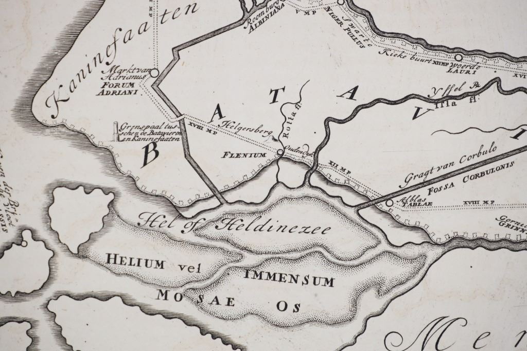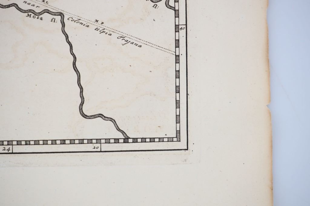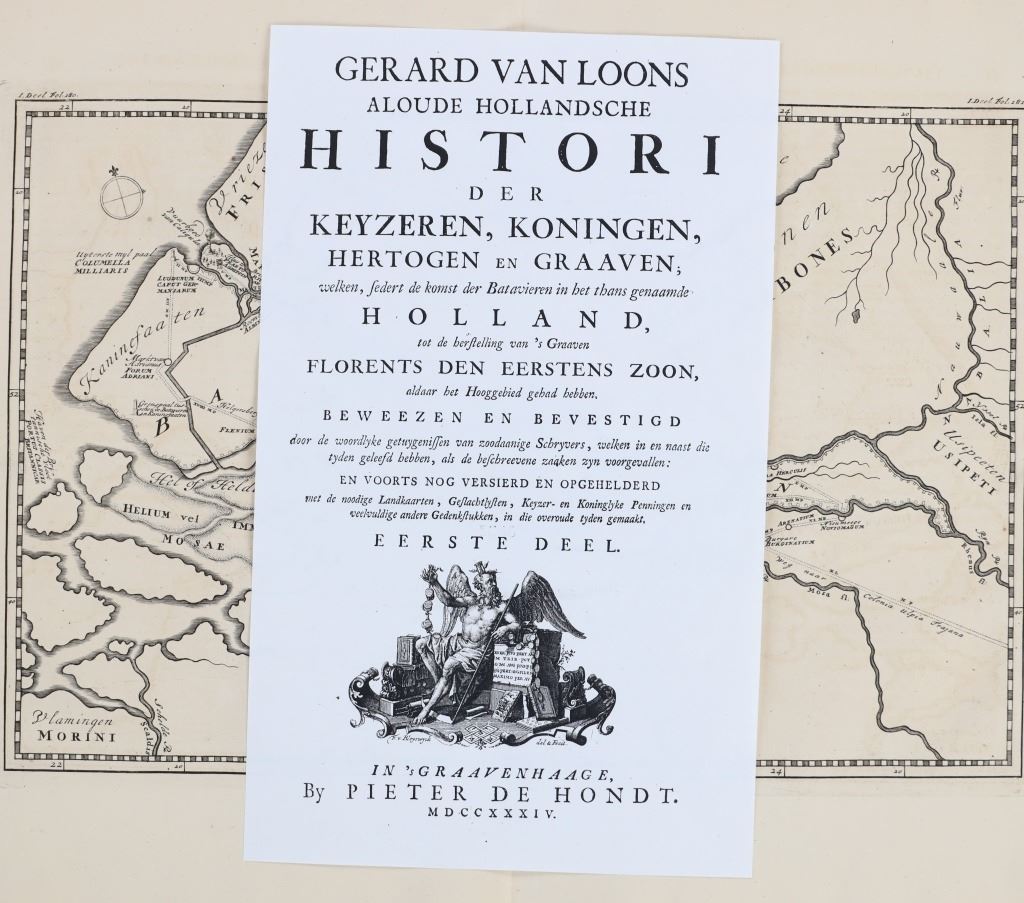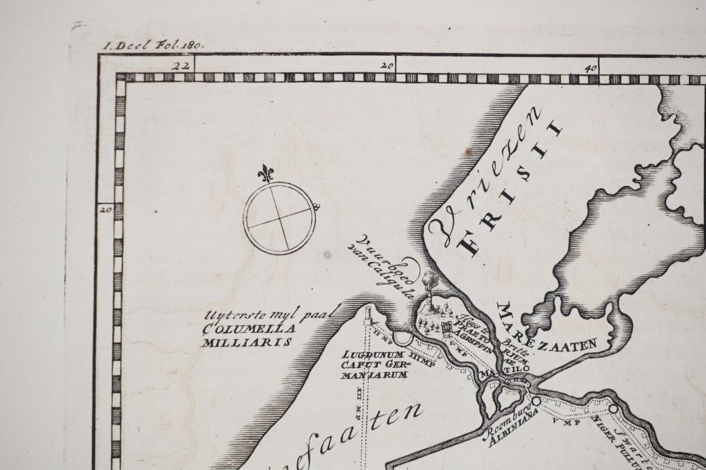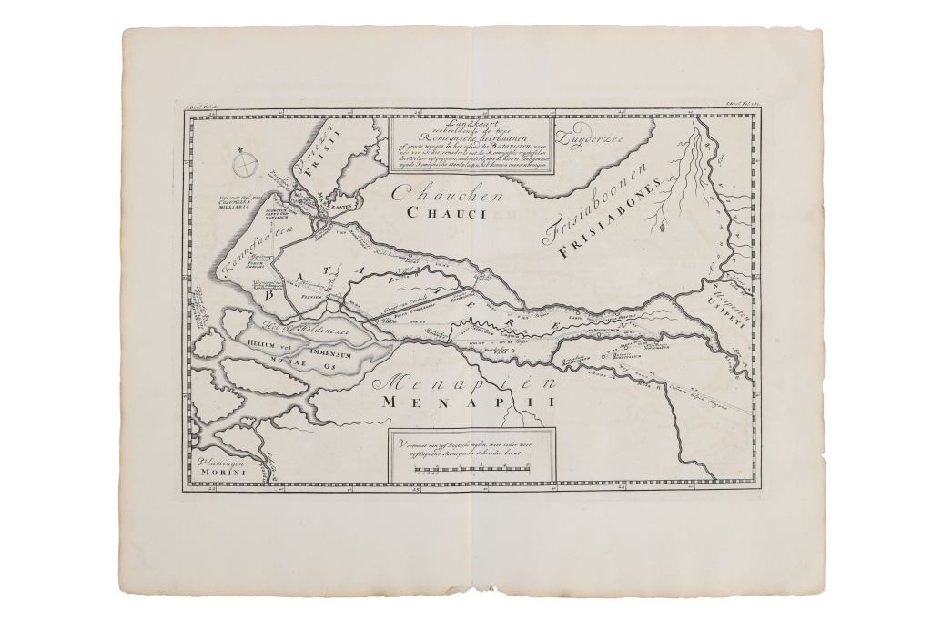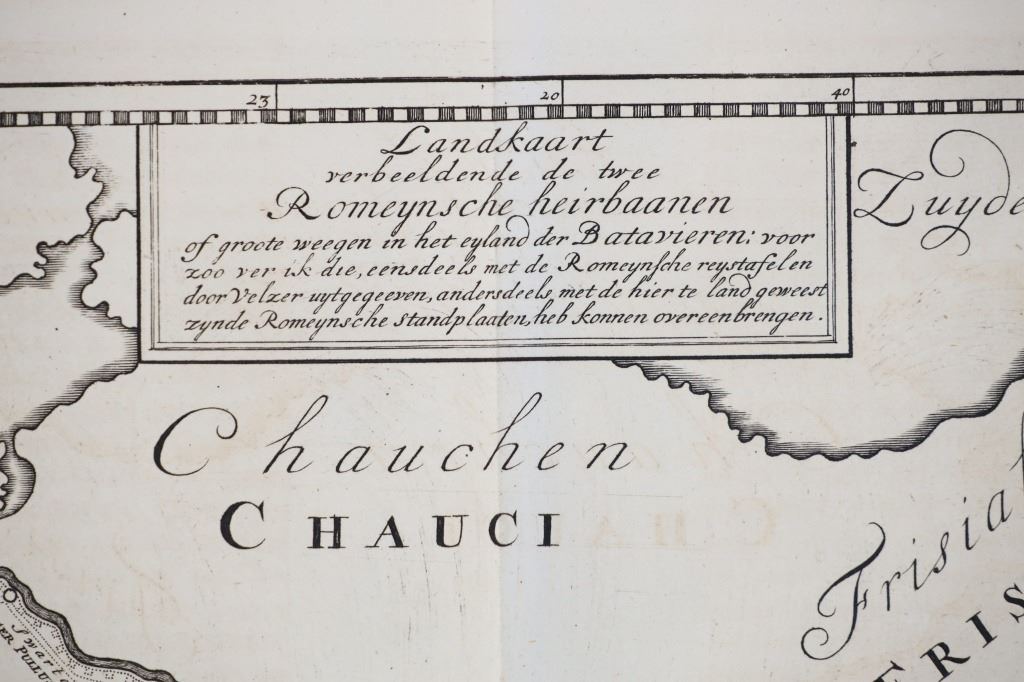 Featured in this lot is this Dutch map of Roman Highways on the Isle of the Batavians titled: "Landkaart verbeeldende de twee Romeynsche heirbaanen of groote weegan in heteyland der Batavieren: voor zoo ver ik die, eensdeels met de Romeynsche seystrafelen door Velzer uytgegeeven, andersdeels, met de heir te land geweest zynde Romeynsche standplaaten, heb konnen overeenbrengen". The map can be showcased in 1734 Historie der Keyzeren, Koningen, Hertogen en Graaven; welken, federt de komst der batavieren in bet thans genaamde" by Gerard van Loon. The book is a richly illustrated historical chronicle of the emperors of the Holy Roman Empire, written in Dutch. Van Loon, a noted historian and numismatist, combined detailed biographies of the emperors with engravings of medals and coins associated with their reigns, offering a visual and textual record of imperial power and iconography. The book reflects Enlightenment-era interests in classical antiquity, political lineage, and the symbolic language of authority, making it both a scholarly resource and a collector’s item for those interested in European history and numismatics. The condition of this Dutch map is well preserved with some wrinkling and discoloration to the edge of the map with browning to the page consistent with age but otherwise shows a well preserved overall condition. The measurements of this map is 16 3/4" x 20 3/4". The collective weight U4oz.