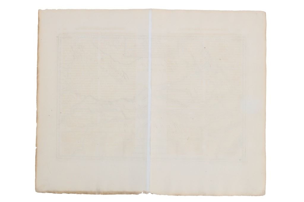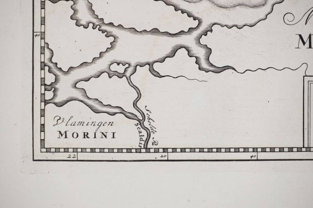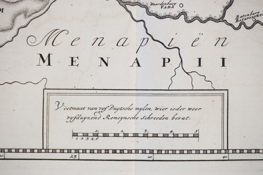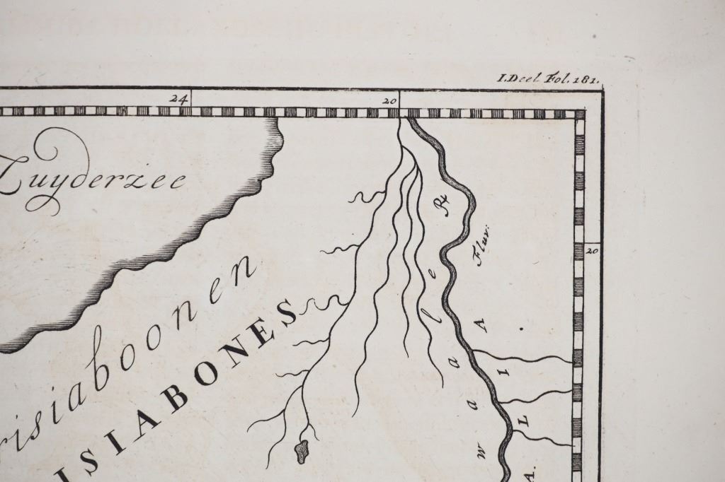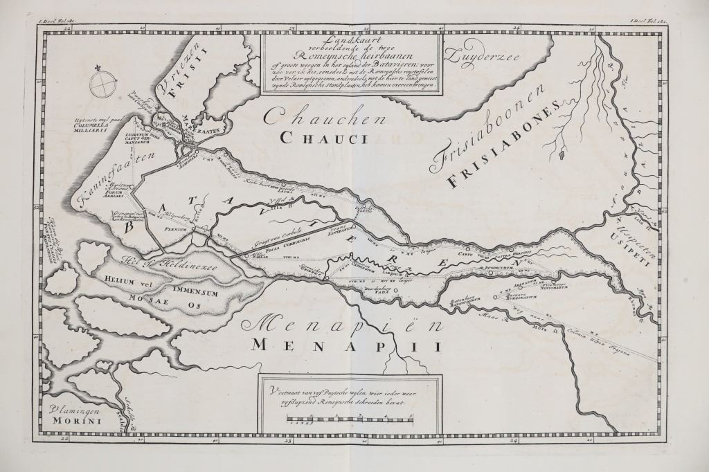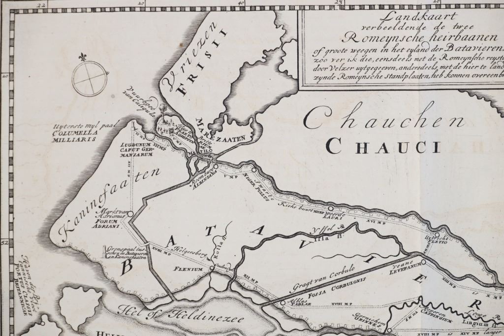 Featured in this lot is this Dutch map of Roman Highways on the Isle of the Batavians titled: "Landkaart verbeeldende de twee Romeynsche heirbaanen of groote weegan in heteyland der Batavieren: voor zoo ver ik die, eensdeels met de Romeynsche seystrafelen door Velzer uytgegeeven, andersdeels, met de heir te land geweest zynde Romeynsche standplaaten, heb konnen overeenbrengen". The map can be showcased in 1734 Historie der Keyzeren, Koningen, Hertogen en Graaven; welken, federt de komst der batavieren in bet thans genaamde" by Gerard van Loon. The book is a richly illustrated historical chronicle of the emperors of the Holy Roman Empire, written in Dutch. Van Loon, a noted historian and numismatist, combined detailed biographies of the emperors with engravings of medals and coins associated with their reigns, offering a visual and textual record of imperial power and iconography. The book reflects Enlightenment-era interests in classical antiquity, political lineage, and the symbolic language of authority, making it both a scholarly resource and a collector’s item for those interested in European history and numismatics. The condition of this Dutch map is well preserved with some wrinkling and discoloration to the edge of the map with browning to the page consistent with age but otherwise shows a well preserved overall condition. The measurements of this map is 16 3/4" x 20 3/4". The collective weight U4oz.