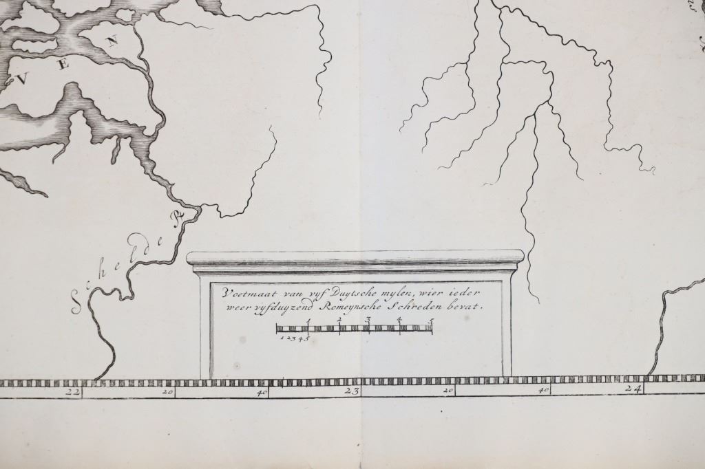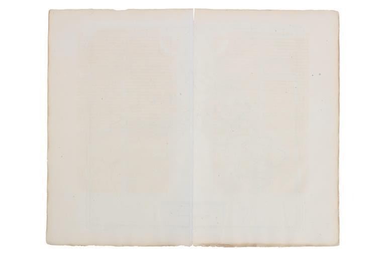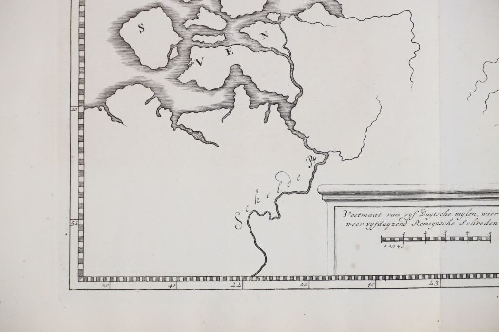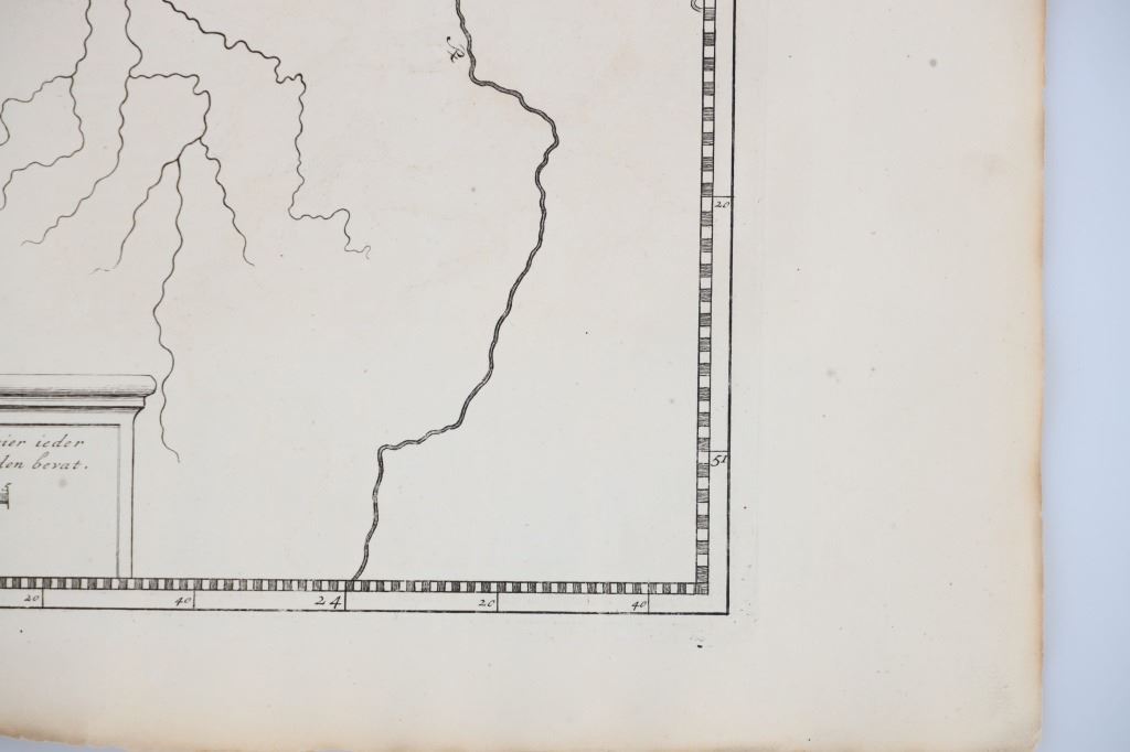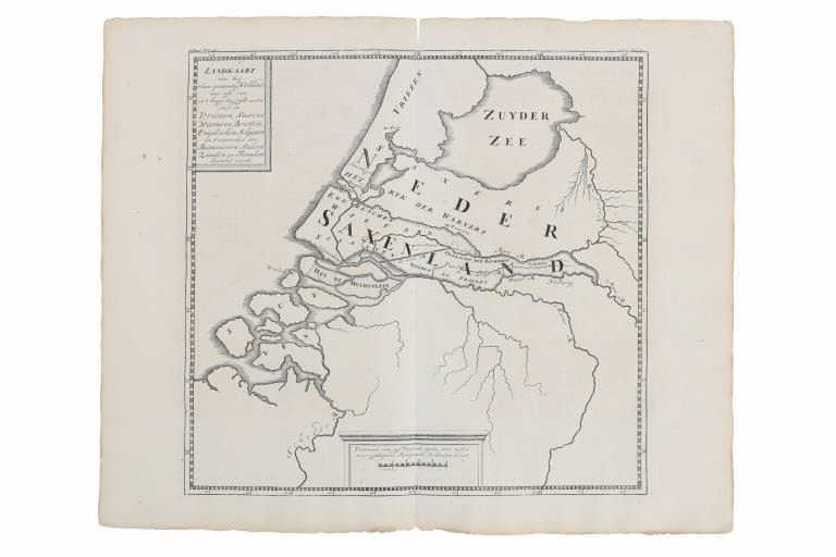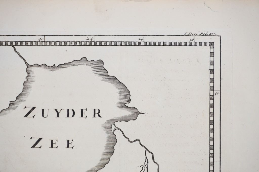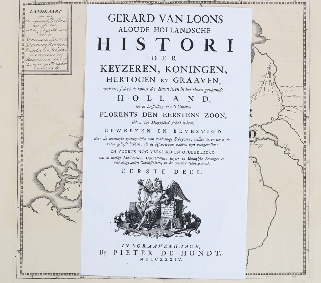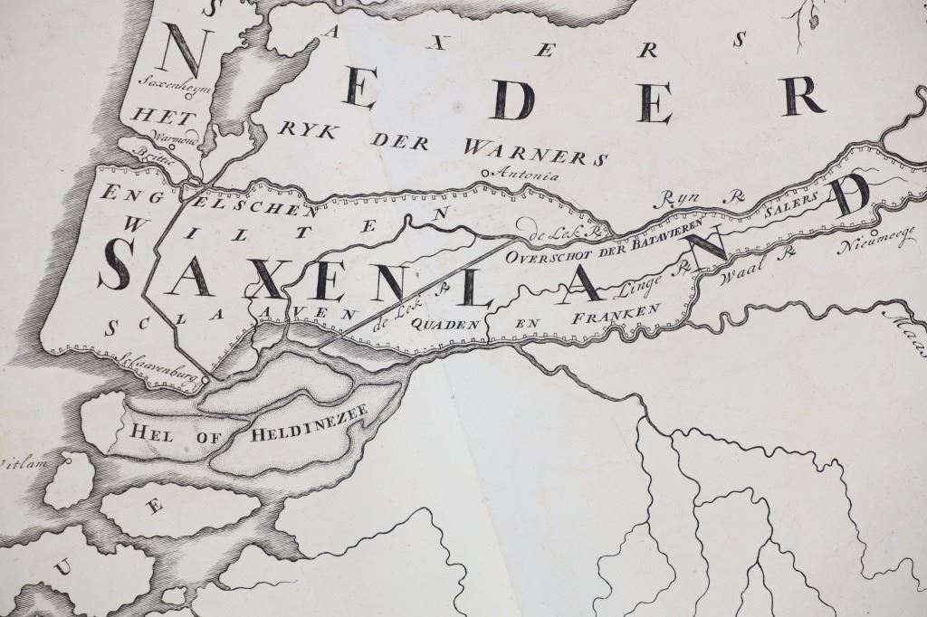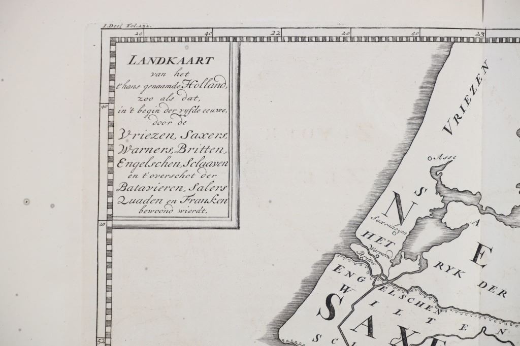 Featured in this lot is this Dutch map from 1745 titled "Landkaart van het t'hans genaamde Holland zoo als dat, in 't begin der vysde eeuwe, door de Vrienzen, Saxers, Warners, Britten, Engelschen, Sclaaven overschot der Bataveiren, Salers,Quden en Franken bewoond wierdt." by Pieter de Hondt found in 1734 Historie der Keyzeren, Koningen, Hertogen en Graaven; welken, federt de komst der batavieren in bet thans genaamde" by Gerard van Loon. The book is a richly illustrated historical chronicle of the emperors of the Holy Roman Empire, written in Dutch. Van Loon, a noted historian and numismatist, combined detailed biographies of the emperors with engravings of medals and coins associated with their reigns, offering a visual and textual record of imperial power and iconography. The book reflects Enlightenment-era interests in classical antiquity, political lineage, and the symbolic language of authority, making it both a scholarly resource and a collector’s item for those interested in European history and numismatics. The condition of this of this Pieter de Hondt map is well preserved with some wrinkling to the maps edge and browning to the page consistent with age but otherwise shows a well preserved condition. The measurements of this 16 3/4" x 20 3/4". The collective weight of this map is U4oz. The map comes with a printed copy of the title page corresponding to the book the map can be found in.